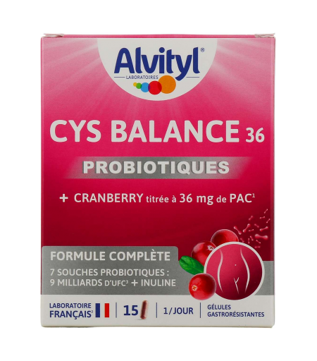 Qu’apporte Alvityl ® Cys Balance 36 ?Alvityl® CYS BALANCE 36 est une formule complète qui contient un extrait de Cranberry titré à 36 mg de PAC (ProAnthoCyanidines), enrichie de 7 souches probiotiques dosées à 9 milliards d’UFC et d’inuline. Cette combinaison d’ingrédients soigneusement sélectionnés crée une synergie d’action unique. La capsule gastro-résistante est conçue pour protéger les souches microbiotiques jusqu’à leur arrivée dans l’intestin. Les probiotiques contribuent à l’équilibre de la flore intestinale. ...