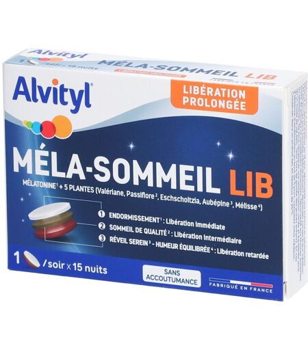 Complément alimentaire à utiliser dans le cadre d’une alimentation variée, équilibrée et d’un mode de vie sain.Alvityl® Méla-Sommeil LIB est un comprimé tricouche à libération prolongée à base de plantes et de mélatonine. Il permet une libération progressive et durable des ingrédients actifs dans le respect de notre chronobiologie, garantissant un sommeil de qualité et un réveil en sérénité.Les trois couches sont libérées successivement permettant la mise en place d’une action spécifique de chaque couche selon les cycles du sommeil.BénéficesCouche 1 à libération immédiate : Composée de mélatonine pour contribuer à réduire le temps d’endormissement*, de valériane pour favoriser le sommeil et de vitamine B6Couche 2 à libération intermédiaire : Composée d’eschscholtzia et de passiflore pour favoriser un sommeil de qualitéCouche 3 à libération retardée : Composée de mélisse pour contribuer à maintenir une humeur normale et équilibrée et d’aubépine pour réduire la nervosité.Valeurs nutritionnelles Pour 1 comprimé COUCHE 1 : 1ère libération Mélatonine 1 mg Valériane 600 mg* Vitamine B6 1,4 mg (100% des VNR***) COUCHE 2 : 2ème libération Mélatonine 0,85 mg Passiflore 800 mg* Eschscholtzia 30 mg* COUCHE 3 : 3ème libération Aubépine 210 mg* Mélisse 600 mg* *Équivalent plante **Conformément à la réglementation en vigueur***Valeurs Nutritionnelles de RéférenceComprimé sans colorant artificiel, sans conservateur** ni édulcorantConseils d'utilisationPrendre un comprimé par soir avec un grand verre d’eau 30 minutes avant le coucher.Précautions d'emploiAlvityl® Méla-Sommeil LIB est un complément alimentaire à base de mélatonine, vitamine B6 et de plantes réservé à l’adulte à partir de 18 ans. Ne pas dépasser la dose journalière recommandée. Déconseillé aux femmes enceintes ou allaitantes, les personnes sous contrôle médical doivent demander conseil à leur médecin avant de prendre ce complément.Poids net12,9 g = 15 comprimés à avalerAdresse du FabricantLABORATOIRES URGO HEALTHCARE42, rue de Longvic, 21300 Chenôve, France ...