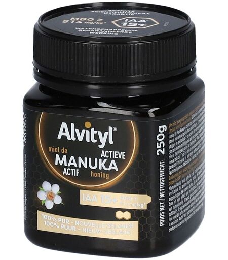 Il est important d'avoir une alimentation variée et équilibrée et un mode de vie sain.Connue de l’humanité depuis des temps reculés, l’action bienfaisante du miel a été de mieux en mieux comprise au cours du 20e siècle grâce aux progrès de la science. Par sa composition toute particulière, plusieurs années de recherche ont mis en évidence une activité du miel de Manuka bien supérieure aux autres miels.Par ses propriétés uniques, l’authentique miel de Manuka Actif est considéré comme un miel rare et précieux. La plante particulière dont il est issu, l’environnement climatique ainsi que les conditions dans lesquelles il est récolté sont les gages de sa qualité. Tous les miels de Manuka ne sont pas authentiques et efficaces, Alvityl garantit l’efficacité de ses miels de Manuka Actifs.Du sucre d’origine naturelle, un peu d’eau et des centaines de substances issues des plantes et transformées par les abeilles : voilà ce que contiennent tous les miels. Ce qui rend le miel de Manuka Actif si unique, c’est sa forte teneur en méthylglyoxal (MGO), un composé issu du nectar des fleurs de cette plante australe.L’« IAA® », permet de mesurer l’activité du miel de Manuka. Plus l’indice est élevé, plus la concentration en méthylglyoxal est importante, plus le miel est actif.Les miels courants démontrent une activité limitée dans le temps à cause de la dégradation du peroxyde d’hydrogène (eau oxygénée) par l’organisme.Composition:100% Miel de Manuka (de Nouvelle-Zélande) IAA® 15+ (MGO 514 mg/kg*)Valeur nutritionnelle: Pour 100 gValeur énergétique1394 kj /378 kcalMatières grasses0 gdont acides gras saturés0 gGlucides82 gdont sucres73 gProtéines0 gSel0 gConseil d'utilisation:1 à 2 cuillères à café par jour sont recommandées.Précautions d'emploi:Ne pas donner aux enfants de moins de 1 an. Ne pas dépasser la dose recommandée. Tenir hors de portée des jeunes enfants. Conserver au sec et a l'abri de la lumière.Poids net:250 gFabricant:Laboratoires URGO Healthcare42, rue de Longvic21300 ChenôveFrance ...