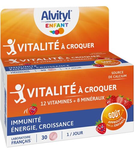 Complément alimentaire à utiliser dans le cadre d’une alimentation variée, équilibrée et d’un mode de vie sain.Alvityl Vitalité 90 Comprimés à Avaler est un complément alimentaire dont la formule associe 12 vitamines et 8 minéraux spécialement dosés dans un comprimé facile à avaler pour couvrir 100% des valeurs nutritionnelles de référence en vitamines pour :assurer à l'organisme forme et vitalité physique grâce aux vitamines B3, B6, B9 et C, au fer et au magnésium qui aident à réduire la fatigue,participer à la croissance osseuse grâce à la vitamine D.Goût chocolat.Sans gluten, sans lactose.Fabriqué en France.IngrédientsSaccharose ; Vitamines C, E, B3, B5, B2, B6, B1, A, B9, B8, D, B12 ; Oxyde de magnésium, Maltodextrine, Anti-agglomérant : Talc, Sulfate de fer, Amidon de maïs, Oxyde de zinc, Épaississants : Gomme arabique, Shellac ; Sulfate de manganèse, Émulsifiant : Acide gras, Sulfate de cuivre, Arômes, Colorants : Oxydes de fer, Agent d'enrobage : Cire de carnauba, Molybdate de sodium, Sélénite de sodium, Chlorure de chrome.Valeurs nutritionnellesIngrédients actifsPar comprimé% VNR*Vitamine A800 µg100%Vitamine B11,1 mg100%Vitamine B21,4 mg100%Vitamine B3 (PP)16 mg100%Vitamine B56 mg100%Vitamine B61,4 mg100%Vitamine B80,05 mg100%Vitamine B9200 µg100%Vitamine B122,5 µg100%Vitamine C80 mg100%Vitamine D35 µg100%Vitamine E12 mg100%Zinc10 mg100%Fer14 mg100%Cuivre1 mg100%Molybdène50 µg100%Sélénium50 µg90%Manganèse1 mg50%Chrome20 µg50%Magnésium57 mg15%Conseils d'utilisation1 comprimé par jour à avaler avec un grand verre d'eau. Ne pas croquer.Précautions d'emploiNe pas dépasser la dose journalière recommandée.Prise de 3 semaines conseillée et renouvelable si nécessaire.À prendre en toute saison.Ne peut remplacer une alimentation variée et équilibrée et un mode de vie sain.Tenir hors de portée des enfants.À conserver à une température inférieure à 25°C.Poids net30 comprimésAdresse du FabricantLABORATOIRES URGO HEALTHCARE 42, rue de Longvic, 21300 Chenôve, France² ...