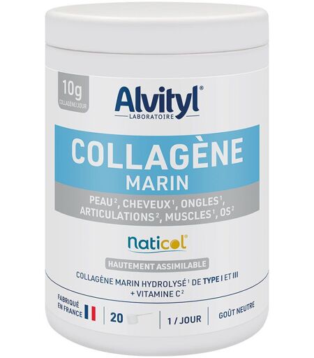 Complément alimentaire à utiliser dans le cadre d’une alimentation variée, équilibrée et d’un mode de vie sain.Alvityl Collagène Marin Goût Neutre est un complément alimentaire à base de collagène hydrolysé Naticol® de type I et III et de vitamine C. Il contribue à améliorer la fermeté de la peau, à réduire les rides, à renforcer les cheveux et ongles, et à maintenir la masse musculaire. Fabriqué en France, pur à 99 % et hautement biodisponible.IngrédientsHydrolysat de collagène marin (POISSONS) certifié Friend of the Sea (origine Amérique, Asie et/ou Europe), vitamine C.Allergènes : POISSON.Allergènes : Poisson.Valeurs nutritionnelles Pour 10 gAJR* Collagène hydrolysé10 000 mg- dont collagène de type I9 500 mg- dont collagène de type III500 mg- Vitamine C80 mg100 % Conseils d'utilisationPrendre 1 dose par jour avec la cuillère-doseuse, diluée dans une boisson froide ou tiède, ou mélangée à un aliment souple. Programme de 20 jours renouvelable.Précautions d'emploiNe pas dépasser la dose recommandée. Réservé à l’adulte. Déconseillé en cas d’insuffisance rénale. Femmes enceintes ou allaitantes : demander conseil à un professionnel de santé. Tenir hors de portée des enfants. Conserver dans un endroit frais, sec et à l’abri de la lumière.Poids net210 gAdresse du FabricantLaboratoires URGO Healthcare42 rue de Longvic21300 ChenôveFrance ...