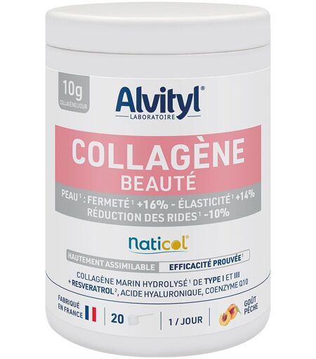 Complément alimentaire à utiliser dans le cadre d’une alimentation variée, équilibrée et d’un mode de vie sain.Alvityl Collagène Beauté Goût Pêche est un complément alimentaire à base de collagène marin hydrolysé Naticol® pur à 99 %, de types I et III, associé à de l’acide hyaluronique, du trans-resvératrol et de la coenzyme Q10. Cette formule contribue à améliorer l’élasticité, la fermeté et l’hydratation de la peau, et à réduire les rides. Fabriqué en France.IngrédientsHydrolysat de collagène marin (POISSONS) certifié Friend of the Sea (origine Amérique, Asie et/ou Europe), arôme naturel, hyaluronate de sodium, trans-resvératrol, coenzyme Q10.Allergènes : POISSONS.Allergènes : Poisson.Valeurs nutritionnelles Pour 1 dose (10,5 g)AJR* Collagène hydrolysé10 000 mg- dont collagène de type I9 500 mg- dont collagène de type III500 mg- Acide hyaluronique50 mg- Trans-resvératrol50 mg- Coenzyme Q1020 mg- Conseils d'utilisationPrendre 1 dose par jour à l’aide de la cuillère-doseuse, diluée dans une boisson froide ou tiède, ou mélangée à un aliment souple. Programme de 20 jours renouvelable.Précautions d'emploiRéservé à l’adulte. Ne pas dépasser la dose journalière recommandée. Déconseillé en cas d’insuffisance rénale. Les femmes enceintes ou allaitantes doivent consulter un professionnel de santé. À consommer sous contrôle médical en cas de traitement médicamenteux. Tenir hors de portée des enfants. Conserver dans un endroit frais, sec et à l’abri de la lumière.Poids net210 gAdresse du FabricantLaboratoires URGO Healthcare42 rue de Longvic21300 ChenôveFrance ...