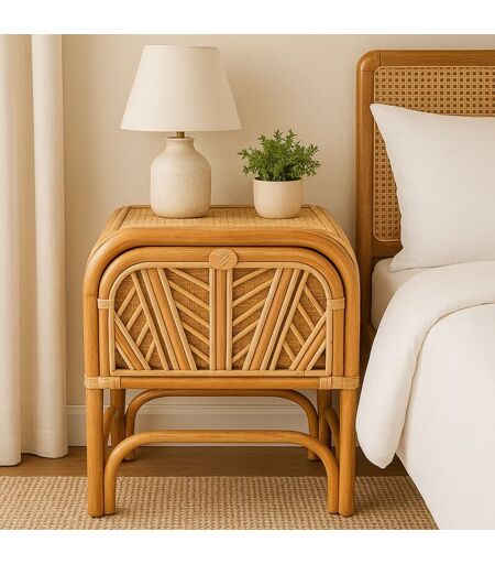 Ajoutez une touche naturelle et élégante à votre chambre avec la table de chevet en rotin et bambou "R017". Son design authentique en rotin et bambou tressés, associé à une finition mélamine laquée miel naturel, apporte une note bohème chaleureuse qui s'intègre facilement à tout type de décoration : naturelle, scandinave ou vintage. Grâce à sa structure en âme de rotin légère et robuste, cette table de chevet se déplace facilement selon vos besoins, vous permettant de réorganiser votre espace sans effort. Pratique, la table "R017" est équipée d'un tiroir au design élégant, permettant de ranger vos affaires à l'abri tout en ajoutant une touche décorative à votre espace nuit. Son espace de rangement fermé avec étagère intégrée est idéal pour vos livres, accessoires ou objets personnels, tout en maintenant un espace ordonné et épuré. Le tissage en rotin et bambou confère à ce meuble un aspect artisanal et naturel, tout en assurant robustesse et durabilité pour un usage quotidien. Livrée ...