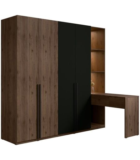 Meublorama - Armoire 4 portes avec coiffeuse intégrée norvik – Noyer et noir – Miroir, led et rangements inclus