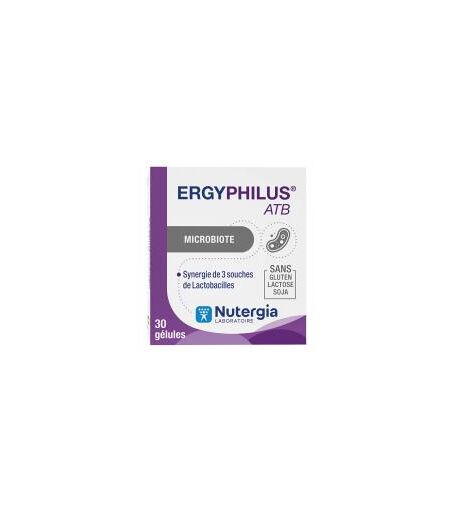 ERGYPHILUS® ATB est un complément alimentaire constitué d'une synergie unique de 3 souches vivantes. Il contient des lactobacilles rigoureusement sélectionnés pour leurs propriétés : Lactobacillus plantarum LMG p-21021 Lactobacillus rhamnosus GG ...