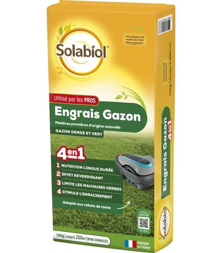 SOLABIOL Engrais Gazon Longue Durée - Sac 10 Kg - Jusqu'à 330m² - Utilisable En Création & En Entretien De Gazon - Résiste Au Piétinement - Gazon