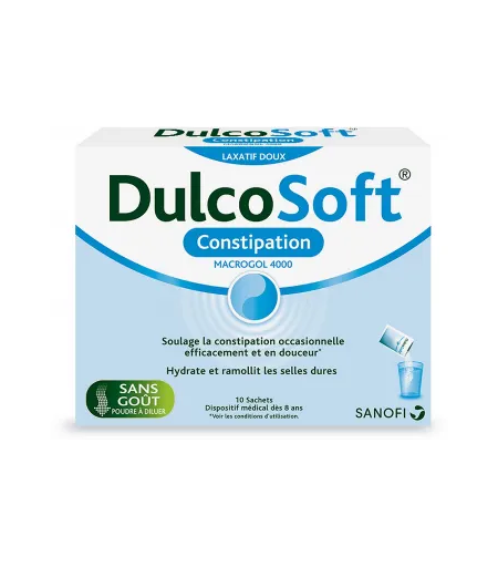 Dulcosoft constipation est utilisé pour le traitement symptomatique de la constipation occasionnelle et pour le ramollissement des selles dures. Sans goût : peut facilement être mélangée avec des boissons chaudes ou des boissons froides (eau plate ou pétillante, jus d'orange ou jus de pomme, thé glacé ou eau chaude). ...