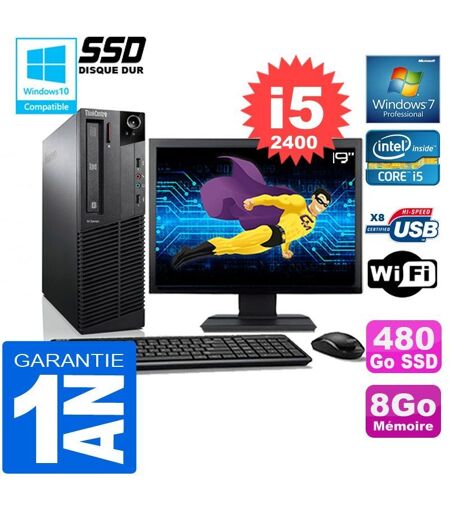 PC Lenovo M92p SFF Core I5-2400 Ram 8Go Disque 480 Go SSD Wifi W7 Ecran 19