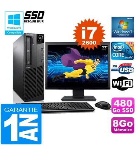 PC Lenovo M92p SFF Core I7-2600 Ram 8Go Disque 480 Go SSD Wifi W7 Ecran 22