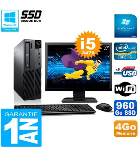 PC Lenovo M92p SFF Ecran 27" Core I5-3470 4Go Disque 960Go SSD Wifi W7