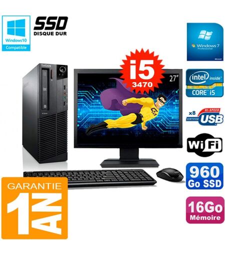 PC Lenovo M92p SFF Ecran 27" Core I5-3470 16Go Disque 960Go SSD Wifi W7