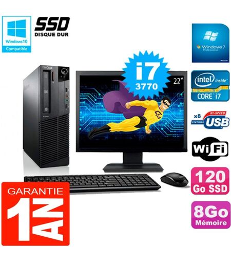 PC Lenovo M92p SFF Ecran 22" Core I7-3770 8Go Disque 120Go SSD Wifi W7