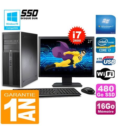 PC Tour HP Compaq 8200 Core I7-2600 Ram 16Go Disque 480Go SSD Wifi W7 Ecran 27