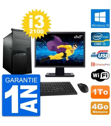 PC Tour Lenovo M91p Ecran 22" Intel i3-2100 RAM 4Go Disque 1To Windows 10 Wifi