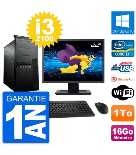 PC Tour Lenovo M91p Ecran 22" Intel i3-2100 RAM 16Go Disque 1To Windows 10 Wifi