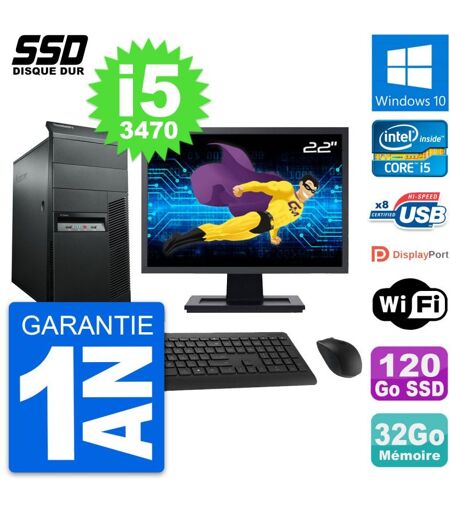 PC Tour Lenovo M92p Ecran 22" Intel i5-3470 RAM 32Go SSD 120Go Windows 10 Wifi