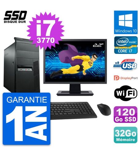 PC Tour Lenovo M92p Ecran 22" Intel i7-3770 RAM 32Go SSD 120Go Windows 10 Wifi