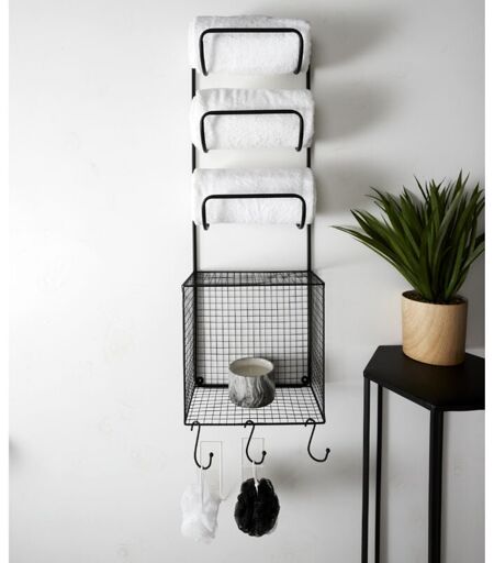 Rangez malin avec ce porte serviettes astucieux et pratique au quotidien ! Composé de 3 barres et d'un panier filaire de rangement, il s'accroche dans votre salle de bain et apportera une touche déco. ...