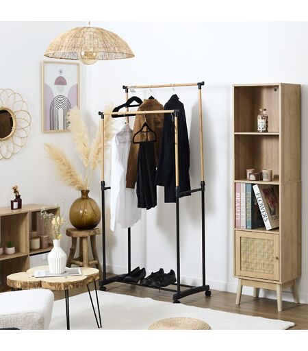 Le portant double effet bois à roulettes est idéal pour maximiser votre espace de rangement tout en apportant une touche élégante à votre intérieur. Doté de deux barres suspendues, il permet d'organiser davantage de vêtements en optimisant la hauteur et la largeur disponibles. Sa hauteur réglable offre une grande flexibilité pour suspendre aussi bien des chemises que des manteaux longs ou des robes. La combinaison de l'effet bois et du métal noir lui confère un style moderne et robuste, parfait pour une chambre, un dressing ou une entrée. Grâce à ses roulettes pivotantes à 360°, il se déplace facilement selon vos besoins. ...