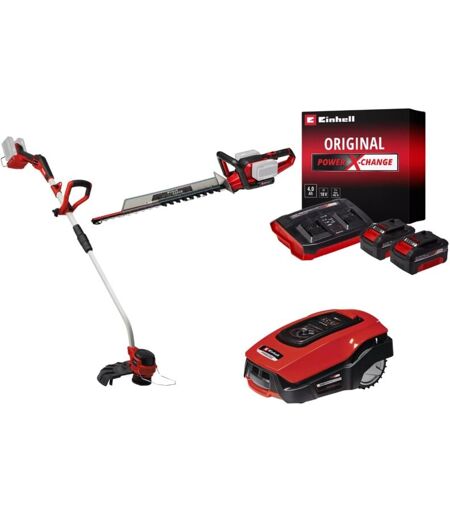 EINHELL Kit premium jardin sans fil Einhell – Taille-haies 36V, coupe-bordure 36V, robot tondeuse + batteries 4.0Ah