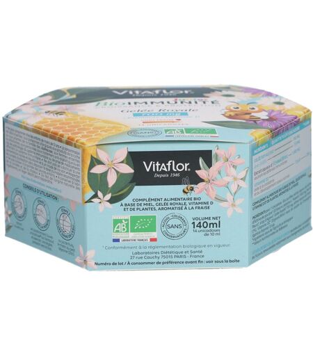 Complément alimentaire à utiliser dans le cadre d’une alimentation variée, équilibrée et d’un mode de vie sain.Vitaflor BioImmunité Gelée Royale Bio 700 mg Junior 14 Unicadoses est un complément alimentaire à base de miel, gelée royale, vitamine D et de plantes, aromatisé à la fraise. Il est indiqué pour soutenir les défenses immunitaires, aider à la croissance et au développement osseux normal des enfants grâce à la vitamine D. Il est particulièrement recommandé lors des changements de saison.Sans conservateur, sans alcool ni colorant.Certifié Agriculture Biologique. Contrôle FR-BIO-01.Fabriqué en France.IngrédientsEau purifiée, Extrait aqueux de racine d'échinacée pourpre* (Echinacea purpurea (L.) Moench), Miel de fleurs*, Sirop d'agave*, Gelée royale*, Arôme naturel de fraise* (1%), Vitamine D2* (Ergocalciférol) issue de poudre de champignon Agaricus bisporus.*Ingrédients issus de l'Agriculture Biologique.Valeurs nutritionnellesIngrédientsPour 1 unicadose% VNR**Gelée royale700 mg-Dont 10-HDA7,5 mg-Extrait aqueux d'échinacée1500 mg-Vitamine D21,5 µg30%**Valeurs Nutritionnelles de Référence.Conseils d'utilisationAgiter l'unicadose avant ouverture.Prendre 1 unicadose par jour diluée dans un verre d'eau ou de jus de fruit (20 cl) le matin au petit-déjeuner.Programme de 14 jours.Ne pas dépasser la dose journalière conseillée.Précautions d'emploiDéconseillé aux personnes sous traitement anti-diabétique et aux personnes allergiques aux produits de la ruche.Ne doit pas se substituer à une alimentation variée et équilibrée et à un mode de vie sain.Ne pas laisser à la portée des jeunes enfants.À conserver à l'abri de la lumière et de la chaleur.Du fait de l'origine naturelle des ingrédients, un léger dépôt peut apparaître.Poids net14 ampoulesAdresse du FabricantLaboratoires Diététique et Santé3, rue des Quatre Cheminées92100 Boulogne BillancourtFrance ...