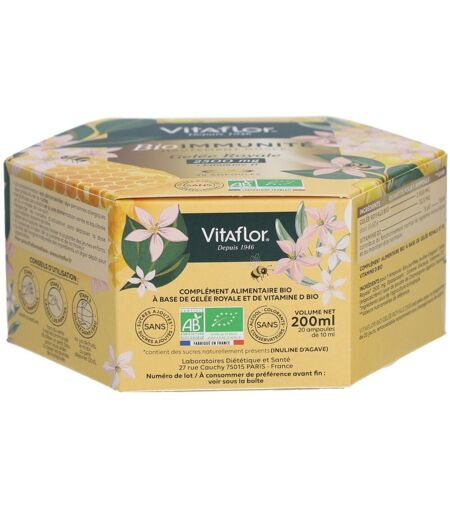 Complément alimentaire à utiliser dans le cadre d’une alimentation variée, équilibrée et d’un mode de vie sain.Le complément alimentaire Vitaflor Gelée royale Bio 2500mg et vitamine D est destiné à l'adulte et a été formulé à partir de gelée royale et de vitamine D3 d'origine végétale. La gelée royale est créée par les abeilles ouvrières et elle est connue pour ses propriétés nutritives. La vitamine D3, quant à elle, a été sélectionné pour participer au maintien de la santé musculaire et osseuse. Vitaflor Gelée royale Bio 2500mg et vitamine D contribue à la vitalité ainsi qu'à une meilleure résistance aux états de fatigue passagère. De manière générale, la prise d'un complément alimentaire à base de gelée royale est conseillée lors des changements de saison. Produit fabriqué en France. Sans colorants, sans sucres ajoutés et sans conservateurs. IngrédientsIngrédients : Eau purifiée, inuline d'agave*, gelée royale* 2500mg, gomme d'acacia du Sénégal purifiée qualité Instant (Acacia Senegal ie Acacia Seyal), Vitamine D2* (ergocalciférol) issue de poudre de champignon (Agaricus bisporus)Valeurs nutritionnellesIngrédientPour 1 ampouleVitamine D25 µg (100% VNR**)*ingrédients issus de l'agriculture biologique **Valeurs Nutritionnelles de RéférenceConseils d'utilisationBien agiter l'ampoule avant son ouverture. Casser par la suite chaque pointe de l'ampoule. Vous pouvez utiliser un tissu pour casser plus facilement les pointes de l'ampoule. L'ampoule se dilue dans un verre d'eau ou de jus de fruits de 20cl au cours du petit déjeuner. Précautions d'emploiEn raison de la composition de ces ampoules, vous pouvez observer un léger dépôt qui n'altère en rien les propriétés de ce complément alimentaire. Ce produit ne se substitue pas à un mode de vie sain et à une alimentation équilibrée.Ne pas dépasser la dose recommandée. Ce produit est destiné à l'adulte. Tenir hors de portée des enfants. A conserver dans un endroit propre et sec, à l'abri de la chaleur et de l'humidité.Consommation déconseillée aux personnes présentant des allergies aux produits de la ruche. Poids net20 ampoulesAdresse du FabricantLaboratoires Diététique et Santé3, rue des Quatre Cheminées92100 Boulogne BillancourtFrance ...
