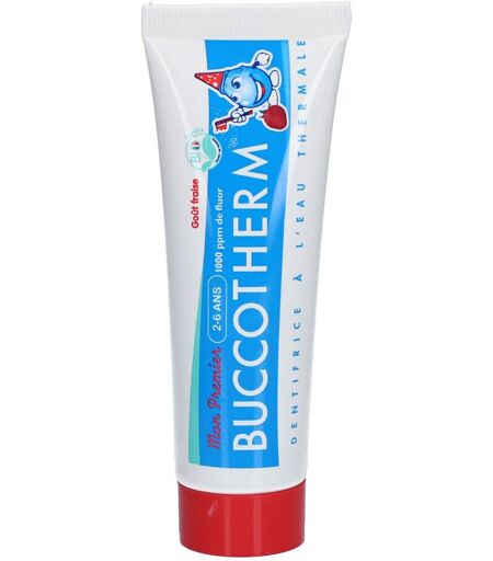 « Mon Premier » 2-6 ans Fraise Certifié BIO BUCCOTHERM® est un gel dentifrice doux, avec un dosage en fluor spécifiquement adapté aux enfants de 2 à 6 ans – 1000 ppm. Composé à 99% d’ingrédients d’origine naturelle et avec son arôme naturel de fraise – sans sucre – il ravira les petits gourmands et les plus récalcitrants au brossage ! Concentré en Eau thermale de Castéra-Verduzan, apaisante et reminéralisante, il aide à prévenir la formation de la plaque dentaire et à lutter contre l’apparition des caries sur les dents de lait, tout en préservant les gencives. Ce flacon recyclable et réutilisable offre 40 jours d’utilisation en moyenne à raison de 2 brossages par jour et se recharge grâce à l’éco-recharge BUCCOTHERM. *Cosmétique Biologique certifiée par ECCOCERT selon le référentiel disponible iciEn brossage quotidien pendant 2 minutes, au moins deux fois par jourAqua (Castera-Verduzan thermal water)*, Hydrogenated Starch Hydrolysate, Glycerin, Hydrated Silica, Cellulose Gum, Decyl Glucoside, Sodium Benzoate, Aroma, Stevia Rebaudiana Extract**, Sodium fluoride, Althaea Officinalis Root Extract**, Potassium Sorbate, CI 77491, Mica, Citric Acid. Contient du fluorure de sodium : 1000ppm * Eau thermale de Castéra-Verduzan stabilisée à pH 8 (procédé breveté) **Ingrédient issu de l’Agriculture Biologique ...