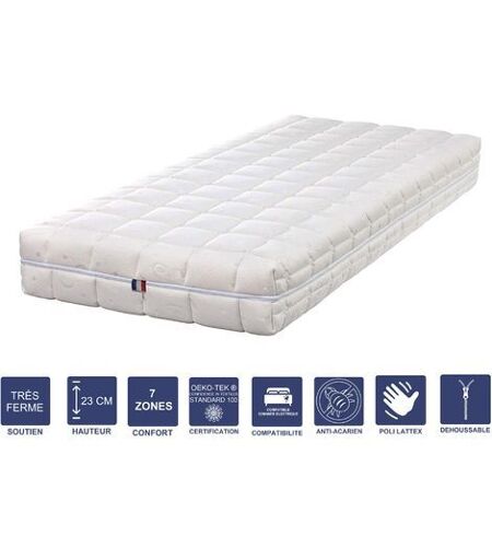 Description MATELAS: Accueil : Ferme Soutien : Trés Ferme Technologie matelas : Face été + âme en Mousse Poli Lattex Derniére Génération Indéformable Trés Haute Résilience - Face Hiver 4,5 cm de Mousse à Mémoire de Forme Trés Haute Densité 60 Kg/m3 " Massante" ?paisseur du matelas : +/- 23 cm REPOS PLUS SAIN grâce au Traitement Anti-acariens / anti-bactérien / Anti-moisissures Trés Bonne Indépendance de couchage br>Il est Spécifique pour les Sommiers Mécaniques et électriques Coutil: Coutil stretch matelassé de 290 gr/m2 de Polyester avec traitement Sanitized Faces de couchage Réversibles - Déhoussable sur 3 Côtés et Housse Lavable à 30¡ position Lavage à la main Délicat - SANITIZED : Traitement antibactérien et anti-moisissures diminuant également le développement des odeurs Structure et garnissage du matelas: Faces Dormeur : 1,5 cm de mousse profilée à Haute Ventilation pour Maximiser le Confort + coutil en tissu 3D pour la bonne Respiration du noyau matelassé Air System Tissu Hyper Respirant réalisé en 3 dimensions qui permet une circulation libre de l'air offrant ainsi une plus grande ventilation et d'hygiène Plate-bande: Tissu Hyper RESPIRANT matelassé avec de la ouate polyester âme noyau : bloc de 15 cm de Mousse HAUTE RESILIENCE Poli Lattex derniére génération Indéformable La structure du matelas est divisée en 7 incroyables zones de confort qui s'adaptent à tous types de morphologies et aident à libérer les tensions musculaires pour soulager les maux de dos provoqués par de mauvaises postures au cours de la journée TISSUS CERTIFIES : Systéme de Qualité Certifié Oeko-tex 100 , Certipur testé contre les substances nocives Certification ISO 9001 ...