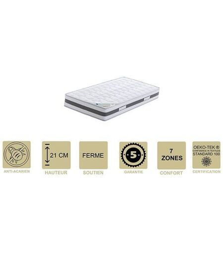 Description MATELAS: · Accueil : Ferme . · Soutien : Ferme . · Technologie matelas : Face été + âme en Mousse Aertech+ 35 Kg/m3 Haute Densité Indéformable Très Haute Résilience - Face Hiver 5,5 cm de Mousse à Mémoire de Forme Très Haute Densité 62 Kg/m3 · Épaisseur du matelas : +/- 21 cm. · REPOS PLUS SAIN grâce au Traitement Anti-acariens / anti-bactérien · Très Bonne Indépendance de couchage. Coutil: · Coutil stretch matelassé de 290 gr/m2 de Polyester avec traitement Sanitized. Faces de couchage Réversibles · SANITIZED : Traitement antibactérien et anti-moisissures diminuant également le développement des odeurs. Structure et garnissage du matelas: · Faces Dormeur : 1 cm de mousse profilée à Haute Ventilation pour Maximiser le Confort + coutil en tissu 3D pour la bonne Respiration du noyau matelassé Air System. · Tissu Hyper Respirant réalisé en 3 dimensions qui permet une circulation libre de l'air offrant ainsi une plus grande ventilation et d'hygiène. · Plate-bande: Tissu Hyper RESPIRANT matelassé avec de la ouate polyester · Âme noyau : bloc de 13 cm de Mousse HAUTE RESILIENCE Aertech+ 35 Kg/m3 Haute Densité Indéformable · La structure du matelas est divisée en 7 incroyables zones de confort qui s'adaptent à tous types de morphologies et aident à libérer les tensions musculaires pour soulager les maux de dos provoqués par de mauvaises postures au cours de la journée. · TISSUS CERTIFIES : Système de Qualité Certifié Oeko-tex 100 , Certipur testé contre les substances nocives. Certification ISO 9001 ...