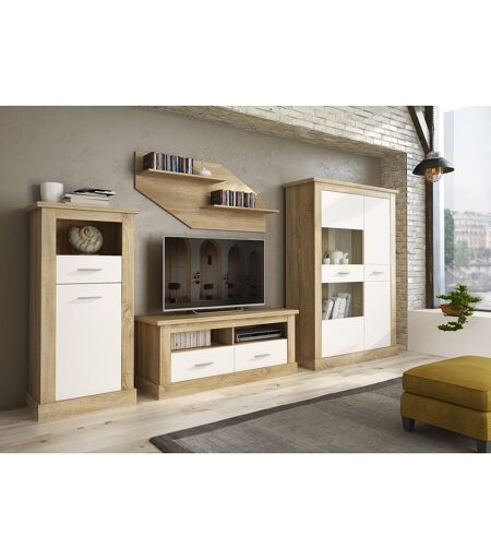 Ensemble de salon meuble TV équipé de 2 tiroirs + étagère murale + buffet + vitrine basse coloris chêne cambrian et blanc. Dimensions meuble TV : longueur 135 x profondeur 41,8 x hauteur 56,6 cm Dimensions vitrine basse : longueur 125 x profondeur 41,8 x hauteur 174,70 cm Dimensions étagère murale : longueur 130 x profondeur 23 x hauteur 58 cm Dimensions buffet : longueur 66 x profondeur 36,60 x hauteur 135 cm Matière : Panneau de particule mélaminé Couleur : chêne cambrian, blanc Poids : 48 kg ...