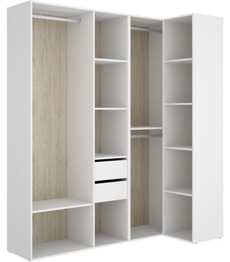 Ensemble dressing d'angle avec 2 tiroirs et fond d'arrière réversible fabriqué en bois mélaminé coloris chêne naturel, blanc. Dimensions : Longueur 1825 x Profondeur 79 x Hauteur 205 cm Matière : Bois mélaminé Couleur : chêne naturel, blanc. Poids : 128 kg ...