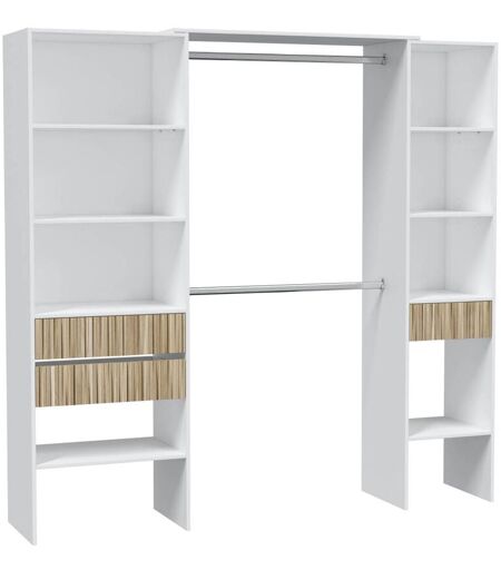Armoire, dressing équipée de 3 tiroirs, 6 étagères et 2 barres de suspension. Glissières en métal pour le tiroir. Fond du tiroir avec épaisseur de 3 mm. Chants en PVC avec épaisseur 6 mm Dimensions meuble : longueur 190 x hauteur 187 x profondeur 40 cm Dimensions tiroir : longueur 34 x hauteur 35 x profondeur 10 cm Matière : mélamine Poids supporté par étagère : 8 KG Poids supporté par barre de suspension : 5 KG Coloris : blanc artic, naturel Poids : 61,4 KG ...