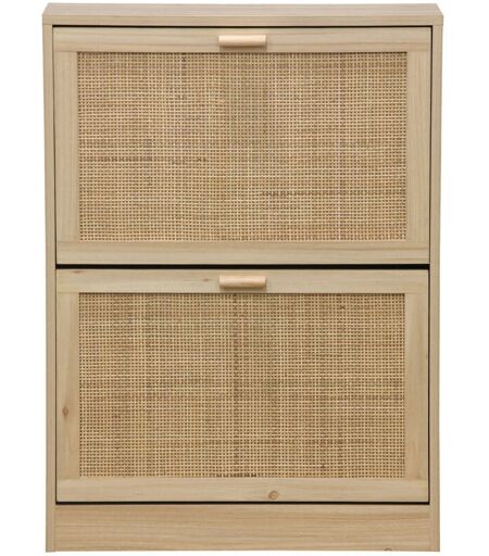 Etagère de chaussures équipée de 2 portes avec étagères en décor pin coloris naturel. Capacité pour 12 paires de chaussures. Façade décorative en rotin sur les portes. Dimensions : Longueur 60 x profondeur 24 x hauteur 82 cm Matière : bois de rotin, décor pin Coloris : naturel Poids : 18 kg ...
