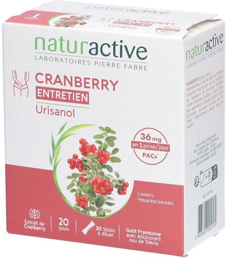 Complément alimentaire à utiliser dans le cadre d’une alimentation variée, équilibrée et d’un mode de vie sain.Naturactive Urisanol Cranberry Entretien 20 Sticks est un complément alimentaire à base d'extrait de plante avec édulcorant.Chaque stick est dosé à 36 mg en ProAnthoCyanidines (PACs), offrant ainsi toute la puissance de la cranberry en une seule prise par jour.Goût framboise.IngrédientsMaltodextrine, Extrait de baies de cranberry (Vaccinium macrocarpon Ait.) sur hydroxyde de magnésium et phosphate tricalcique, Arôme framboise, Acidifiant : Acide citrique, Antiagglomérant : Dioxyde de silicium [nano], Édulcorant : Glycosides de stéviol issus de stévia (naturellement présent dans les feuilles).Valeurs nutritionnellesCompositionPour 1 stickExtrait sec concentré de baies de cranberry960 mgDont ProAnthoCyanidines36 mgConseils d'utilisationAprès une période d'inconfort ou en prévention : Prendre 1 stick le matin pendant 20 jours, à diluer dans un grand verre d'eau. À renouveler sur 3 mois.Précautions d'emploiNe pas dépasser la dose journalière recommandée.En cas de grossesse ou d'allaitement, demander conseil à un professionnel de santé.Ce complément doit être pris dans le cadre d'une alimentation variée et équilibrée et d'un mode de vie sain.Tenir hors de la portée des enfants.Conserver à l'abri de la lumière, de la chaleur et de l'humidité.Poids net20 sticksAdresse du FabricantLaboratoires Pierre Fabre45 Place Abel Gance92100 Boulogne-Billancourt, France ...