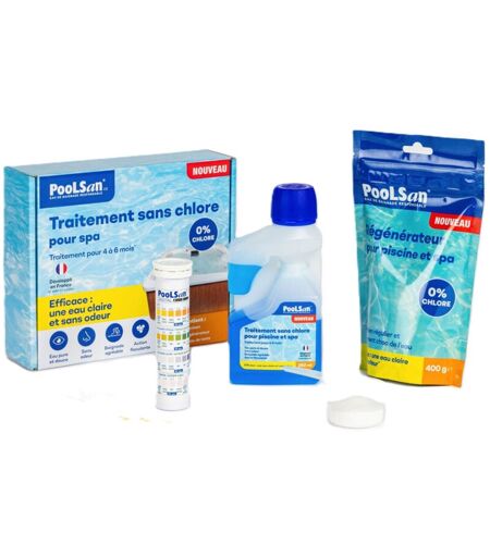 BSI- PooLSan - Kit Sans Chlore - Pour Une Désinfection Sans Chlore Des Spa - Désinfection Totale De Votre Eau - Jusqu'à 4 A 6 Mois - Elaboré En Europe SANS CHLORE, DESINFECTANT AUSSI EFFICACE : La solution PooLSan est sans chlore. Elle se caractérise par l'absence d'agrésivité pour la peau et les yeux. Elle est sans odeur, sans conséquence pour vos installations. Et elle vous apportera une expérience de la baignade inoubliable. La solution PooLSan est à la fois un algicide, un bactéricide, un fongicide, un floculant (pour faciliter la récupération par le filtre des déchets organiques) et PooLSan est rémanent. DOSAGE ET COMPOSITION : Seulement 5 ml de PooLSan CS, liquide bleu, et 15 mg de régénérateur pour 1m³ (1000l), poudre blanche. Le kit est composé de PooLSan CS de 250ml, de 400g de régénérateur, de 25 bandelettes de test. HAUTE QUALITE : Notre produit PooLSan est élaboré en France et conditionné en Belgique. Une garantie d'exigence pour une expérience de baignade unique. Utilisez ...