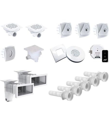 Ce kit de pièces à sceller AquaZendo convient la construction ou la rénovation d'une piscine mesurant 8 x 4 m. Fabriquées en France, toutes les pièces à sceller de ce kit sont de couleurs blanches et conviennent pour des piscines à revêtement béton et liner. Composition du kit de pièces à sceller pour piscine 8 x 4 m : 2 Skimmers design : en ABS traité anti-UV Sortie à visser femelle 1"1/2 - mâle 2" avec régulateur de débit, sortie à coller (à perforer), sortie latérale pour niveau constant, trop plein arrière Ø 50 mm et téléscope rectangulaire 246 x 266 mm qui évite de "re-découper" la margelle. 2 Bondes de fond design : 360° débit 11,75 m³/h pour 0,5 m/s, F2"×11. 3 Buses de refoulement design : avec jet orientable, filetées 2" et taraudées 1" 1/2, débit 10 m³/h à 0,6 Bar. 1 Prises balai design : filetées 2" et taraudées 1" 1/2. 5 Traversées de paroi : F2"× M2", longueur 30 cm sécable. 1 Boîte de jonction : 1 Entrée / 2 Sorties Ø 50 mm. 1 Projecteur EASYLED design 12 LED 36W blanc à ...