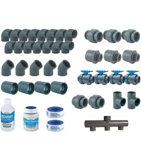Un kit plomberie PVC pour piscine 8 x 4 m Ce kit de plomberie AquaZendo se compose de toutes les pièces de raccords PVC nécessaires à la construction d'une piscine mesurant 8 x 4 m. Toutes les pièces sont en PVC pression PN 16 bars et répondent aux mormes européennes : Pour les raccords : ISO 727 - UNI 7442/75 - DIN 8063 - KIWA 54 - NF T54-028 Pour les filetages : ISO R7 - UNI-ISO 228 - BS 21 - DIN 2999 Composition du kit de plomberie pour piscine 8 x 4 m : 1 Collecteur d'aspiration 3 entrées/1 sortie avec 2 bouchons d'extrémité Ø 50 mm 4 Vannes à coller Ø 50 mm (femelle à coller, siège de bille réglable double union, poignée bleue) 1 Embout mixte 50 × 63 × 2 mm (femelle-mâle à coller / mâle fileté) 2 Embouts mixte 50 × 63 × 1"1/2 mm (femelle-mâle à coller / mâle fileté) 3 Manchons union 3 pièces Ø 50 mm (femelle à coller / mâle fileté avec joint O'ring EPDM) 2 Tés à 90° Ø 50 mm (femelle à coller) 15 Coudes à 90° Ø 50 mm (femelle à coller) 5 Coudes à 45° Ø 50 mm (femelle à coller) 4 Manchons à emboîture longue Ø 50 mm (femelle à coller) 2 Union 3 pièces Ø 50 mm (femelle à coller) 1 Tube de colle gel bleu de 250 ml avec pinceau 1 Décapant PVC / PVC-C de 250 ml 2 Rouleaux de Teflon ruban (largeur : 12 mm / longueur : 12 m / épaisseur : 0,08 mm) Caractéristiques techniques Couleur:Gris Dimensions de la piscine:8 x 4 m Marque:AQUAZENDO Matière(s):PVC Raccords:50 mm Type de produit:Kit plomberie ...