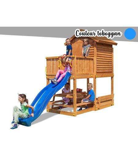 Aire de jeux pour enfants composée de la maisonnette MyHouse, du module FreeTime et du module Beach. Ce grand ensemble est idéal pour recevoir les enfants dans le jardin.La maisonnette sur piloris est accessible avec un escalier, elle est dotée de portes, de fenêtre avec volets, d'un volant, d'un toit et d'un tobogganLe kit de la maisonnette MyHouse comprend :? Toboggan 2,2 m? Ancrages au sol? Capuchons? Supports? Kit de bois coupé? Ensemble de connecteurs métalliques? Ensemble d'outils d'installation? Instructions d'installation "étape par étape" avec les règles de sécurité? Volant? Maisonnette avec toit à deux versants, portes et volets? Échelle avec barreaux métalliquesDeux modules complémentaires viennent compléter la maisonnette MyHouse :1. Module FreeTimeLe module FreeTime est une table de pique-nique qui s'installe sous la maisonnette offrant un espace supplémentaire pour les enfants. Elle peut accueillir jusqu'à 4 personnes. Idéale pour dessiner, prendre son goûter, bavarder, se reposer, jouer ou peindre. 2. Module BeachLe module Beach est un bac à sable dont la conception lui permet une fois déplier de former deux bancs confortables avec dossiers pouvant accueillir jusqu'à 4 personnes. / Âge:3 ans et + / Bac à sable:Oui / Balançoire:Non / Cabane:Oui / Couleur:Bleu / Dimensions (L x l x H):440 x 165 x 285 cm / Garantie:2 ans / Marque:FUNGOO / Matière(s):Bois / Nombre d'utilisateurs maximum:9 / Poids:360 kg / Temps de montage:9 h à 2 personnes / Toboggan:Oui / Traitement:Lasure / Type de bois:Epicéa ...