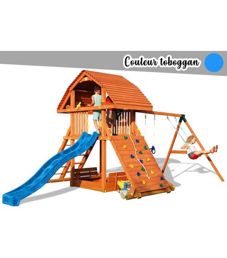 Aire de jeux en bois pour jardin Giant Move + Beach de la marque Fungoo. Cette aire de jeux en bois est composé de la tour Giant en bois et de deux modules : Move + et Beach. De nombreuses activités ludiques et sportives seront au rendez-vous pour des après-midi d'amusement.Le kit tour Giant en bois de la marque Fungoo comprend : ? Toboggan 2,9 m? Ancrages au sol? Supports? Toit en bois? Escaliers en bois? Bac à sable avec 2 sièges? Capuchons? Kit de bois coupé? Ensemble de connecteurs métalliques? Ensemble d'outils d'installation? Instructions d'installation "étape par étape" avec les règles de sécurité? Échelle avec barreaux métalliques? Gouvernail? Lunette? Roches mur d'escalade? Échelle de corde? Dimensions totales assemblées : 385 x 375 x 315 cm? Dimensions de la plateforme : 140 x 116 cm? Hauteur de la plateforme : 145 cm? Longueur du toboggan : 2,9 m? Nombre maximum de personnes : 10Module Move + :? Ancrage pour le fixer au sol? Capuchons? Structure en bois? Joints en métal? Ensemble d'outils d'installation? Instructions d'installation "étape par étape" avec les règles de sécurité? Siège balançoire rouge? Trapèze? Dimensions (L x l x H) : 255 x 275 x 220 cm? Maximum d'utilisateurs : 2Module Beach : Ce module Beach s'intègre sous la tour Giant :? Structure en bois? Joints en métal? Ensemble d'outils d'installation? Instructions d'installation "étape par étape" avec les règles de sécurité / Âge:3 ans et + / Bac à sable:Oui / Balançoire:Oui / Cabane:Oui / Couleur:Bleu / Dimensions (L x l x H):375 x 640 x 310 cm / Garantie:2 ans / Marque:FUNGOO / Matière(s):Bois / Nombre d'utilisateurs maximum:13 / Poids:440 kg / Temps de montage:10 heures à 2 personnes / Toboggan:Oui / Traitement:Lasure / Type de bois:Epicéa ...