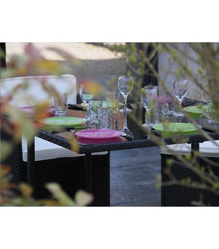 Salon de jardin en résine tressé Artigas 4/8 places Jardideco.Élégant et sobre, ce salon de jardin viendra parfaire votre terrasse. Composé de 4 fauteuils de jardin, de 4 poufs et d'une table en résine tressée et en verre, il peut accueillir de 4 à 8 personnes.? Dimension de la table (L x l x H) : 109 x 109 x 72 m.? Dimensions d'une chaise (L x l x H) : 56 x 52 x 68 cm? Dimensions d'un pouf (L x l x H) : 42 x 42 x 36 cm? Coussins d'assise inclus déhoussables, épaisseur de 5 cm, 180 gr/m', coloris beige.? Table en verre noir, épaisseur 5 cm. ...