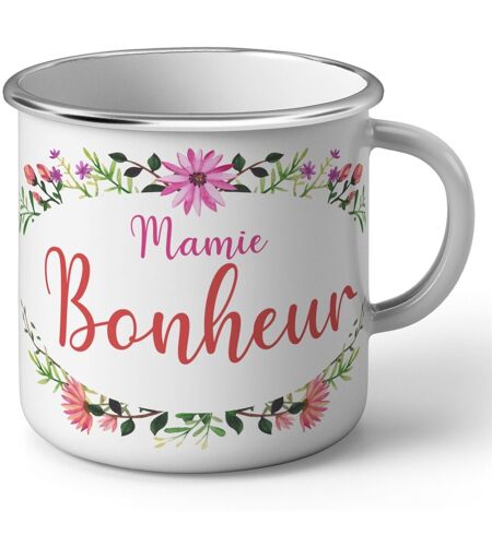 Mug En Métal Emaillé Mamie Bonheur Fleur Frise Florale Calligraphie Grand Mere