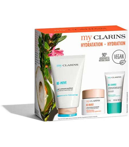 My Clarins Coffret Hydratation Description : Cette crème revitalisante est votre dose d'énergie quotidienne pour dynamiser l'hydratation et l'éclat des peaux jeunes.Formulée avec le [Complexe Végétal Santé] : eau de coco bio et extrait de rose alpine bio pour une peau éclatante et en pleine santé.Enrichie en extraits de baie de goji bio pour stimuler l'énergie, en graine d'acérola (plante bio) pour un teint frais et rosé, et en figue bio pour une hydratation intense de la peau.Texture fraîche, légère et revitalisante.Ce coffret contient :Re Move Gel nettoyant purifiant 125mlRe Boost crème hydra-énergisante 50mlRe Charge masque nuit hydra-repulpant 15mlConseils d'utilisation : Appliquer matin et soir sur une peau propre et sèche.Ingrédients :AQUA/WATER/EAU. CETEARYL ISONONANOATE. GLYCERIN. PROPANEDIOL. CETEARYL ALCOHOL. 1,2- HEXANEDIOL. COCOS NUCIFERA (COCONUT) FRUIT JUICE. BUTYLENE GLYCOL. HYDROXYETHYL ACRYLATE/SODIUM ACRYLOYLDIMETHYL TAURATE COPOLYMER. CETEARYL GLUCOSIDE. GLYCERYL STEARATE. PEG-100 STEARATE. PROPYLENE GLYCOL. XYLITYLGLUCOSIDE. DIMETHICONE. CELLULOSE. TAPIOCA STARCH. ANHYDROXYLITOL. ETHYLHEXYLGLYCERIN. PARFUM/FRAGRANCE. SODIUM POLYACRYLATE. SILICA SILYLATE. XANTHAN GUM. XYLITOL. CAPRYLIC/CAPRIC TRIGLYCERIDE. TARTARIC ACID. CITRIC ACID. GLUCOSE. TAMARINDUS INDICA EXTRACT. SPIRAEA ULMARIA EXTRACT. MARRUBIUM VULGARE EXTRACT. LYCIUM BARBARUM FRUIT EXTRACT. FICUS CARICA (FIG) FRUIT EXTRACT. MALPIGHIA EMARGINATA (ACEROLA) SEED EXTRACT. PHENETHYL ALCOHOL. FURCELLARIA LUMBRICALIS EXTRACT. SODIUM BENZOATE. RHODODENDRON FERRUGINEUM EXTRACT. ARBUTUS UNEDO FRUIT EXTRACT. POTASSIUM SORBATE. SORBIC ACID. LAPSANA COMMUNIS FLOWER/LEAF/STEM EXTRACT. MARIS SAL/SEA SALT/SEL MARIN. ...