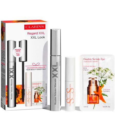 Le mascara Wonder Volume XXL est plus qu'un mascara. Un volume extrême immédiat + le volume des cils non maquillés est boosté jour après jour, comme par un concentré de soin. Regard noir extra intense, tenue extrême. Le [Volumizing Wax Complex] aide à donner plus de volume aux cils et le [Lash Boosting Complex] contribue jour après jour à ce que les cils, même démaquillés, paraissent plus longs : ils paraissent plus volumineux. Pour faire connaissance, le kit contient le mini mascara SOS Lashes Serum. Il s'agit d'un sérum revitalisant & d'un primer pour des cils naturellement soignés. À chaque application, le SOS Lashes Serum Mascara confère aux cils volume, longueur, densité, courbure et définition. Un échantillon test du concentré de soin pour les yeux Double Serum Eye permet d'obtenir un contour des yeux éclatant de beauté et lisse. Des cils au volume extrême.Tenue de 12 heures (test clinique, 33 femmes).Résiste à l'humidité, ne coule pas.Des cils épaissis et renforcés, plus beaux même après le démaquillage. Ce kit contient : Mascara Wonder Volume XXL 8mlMascara SOS Lashes Serum 3mlDouble sérum pour les yeux 0,9ml Application : Commencer par le Double Serum Eye. Réchauffer d'abord le produit entre le bout des doigts/les mains. Appliquer sur les paupières inférieures et supérieures, du coin interne de l'œil jusqu'aux tempes. Pour finir, effectuer quelques pressions entre les sourcils. Ensuite, revitaliser d'abord les cils avec le mascara SOS Lashes Serum. Il est appliqué comme couche de base pour aider les cils abîmés. Appliquer ensuite le mascara de la racine à la pointe. Répéter cette opération pour obtenir un volume extrême et sur mesure. Le mascara peut en outre être fixé avec le mascara Lash & Brow Double Fix'. Ce top coat "imprègne" les cils pour les rendre résistants à l'eau et à la transpiration. ...