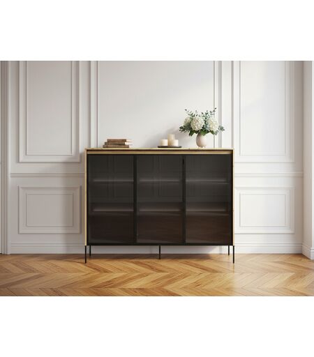 D'inspiration moderne et nature, la collection LENARA habillera parfaitement vos intérieurs de par son design original et ses couleurs tendances et sobres. Les meubles de cette collection sont dotés de nombreux rangements, ce qui facilitera votre organisation quotidienne. L'effet tasseaux de bois sur certains meubles apporte une touche authentique, afin d'avoir un intérieur 100% unique ! Les portes vitrées sur certains autres meubles apportent, quant à elles, un côté épuré. Découvrez le buffet LENARA pour sublimer votre espace de séjour. Doté de 3 portes distinctives et de 9 étagères astucieusement agencées, ce buffet de 150 cm de largeur est la pièce maîtresse idéale pour ajouter une touche d'élégance et d'organisation à votre intérieur. Le buffet LENARA se distingue par son design moderne et épuré qui apporte une note d'élégance à chaque coin de votre espace de séjour. Ses lignes équilibrées et ses finitions soignées en font un meuble qui attirera les regards, tout en s'intégrant harmonieusement à votre séjour. Faites votre choix entre deux coloris sophistiqués : couleur chêne pour une ambiance chaleureuse et naturelle, ou noir pour une esthétique moderne et captivante.Dimensions : Longueur : 150 cm Largeur : 34 cm Hauteur : 118 cm Dimensions des colis : Colis 1 : 134 x 53 x 9 cm / 30 kg Colis 2 : 158,5 x 42 x 9 cm / 23 kg Colis 3 : 107,5 x 54,5 x 11,5 cm / 17 kg ...