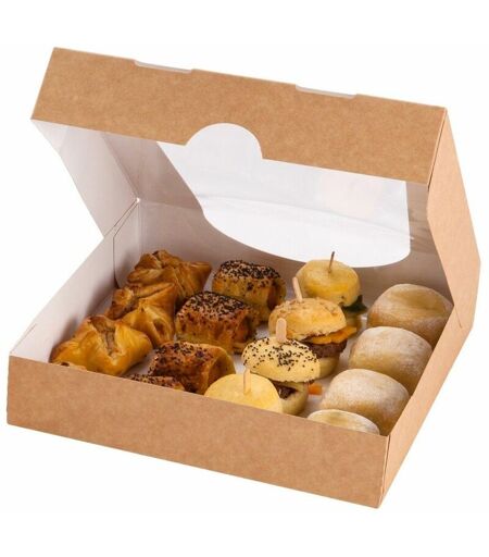 Boîte de protection et de transport idéale pour la consommation nomade et la vente à emporter. Valorisante: large fenêtre pour une parfaite visibilité des produits. Multi-usages: boîte individuelle ou multi-produits, peut contenir des produits chauds ou froids. Non micro-ondable. En kraft brun ingraissable et film en polypropylène (PP). Colis de: 50 Contenance (cc): 1600 Dimensions Lxlxh (cm): 20X20X4 ...
