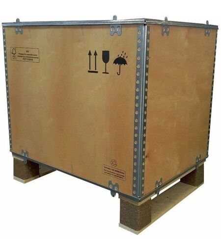 Très résistante: fabriquée en bouleau contreplaqué. Pour constituer une caisse, il faut: un fond, un couvercle et une ceinture de 6 mm à 5 plis. Charnières en acier galvanisé (charnière verticale: 0,4 x 55 mm, charnière horizontale: 0,7 x 50 mm). Facile à monter et à fermer: fond et couvercle à profils agrafés dans lesquels s'insèrent les languettes de la ceinture. Recommandée pour transports par air, terre et mer. Palette vendue séparément (page 54 de ce catalogue). Livrée à plat. Schéma Palette de: 100 Dimensions ext. Lxlxh (mm): 600X400X400 Tare (kg): 3.7 Type: CEINTURE POUR 596045 ...