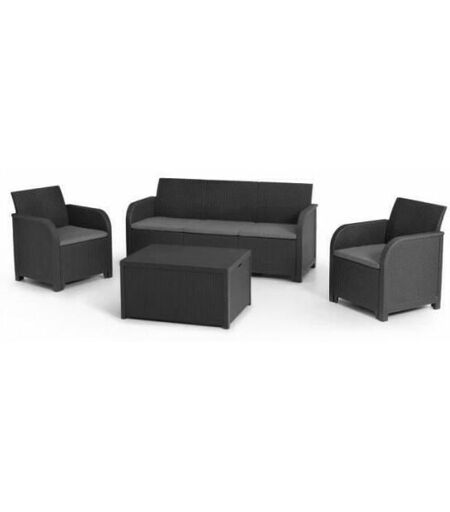 Cet agréable salon de jardin de couleur gris graphite, en résine injectée, se compose d'une banquette 3 places, de deux fauteuils et d'une table basse avec un coffre range-coussins. Ce produit est vendu avec des coussins et dispose de dossiers ergonomiques, ce qui le rendra confortable. Il est a monter soi-meme. ...