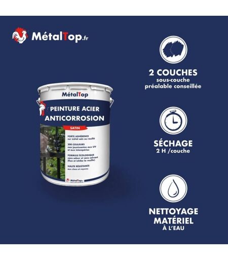 POINTS FORTS Qualité Professionnelle - Fabrication Française Application : Brosse, pinceau, rouleau, pistolet, airless Protection intérieur / extérieur jusqu'à 12 ans Se conserve 3 ans à l'abri du gel et de la chaleur Prix direct fabricant - Contactez-nous pour tout renseignement ou conseil Aspect : Satiné Sec au toucher : 40 min Recouvrable : 2 h Excellent pouvoir couvrant - Facile d'application ALKYDE Peinture acier satinée anticorrosion pour protéger et décorer tous types d'aciers courants. RENDEMENT Pinceau / Rouleau: ± 10 m2 / l en 1 couche - Prêt à l'emploi Pistolet peinture: ± 12 m2 / l en 1 couche - Dilution 10% Bombe aérosol: 1 à 2 m² / 400 ml - Prêt à l'emploi DILUANT & NETTOYAGE Eau. RECOMMANDATIONS Interdire l'application par une température du support inférieure à 10 °C et supérieure à 25 °C. Vérifier que le support soit sain, propre, sec et exempt de matières nuisibles à l'adhérence. Sur support rouillé, utiliser le dérouillant phosphatant ou poncer vigoureusement. ...