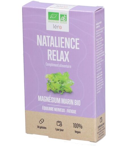 Complément alimentaire à utiliser dans le cadre d’une alimentation variée, équilibrée et d’un mode de vie sain.Léro a développé une formule à base de laitue de mer, source de magnésium qui contribue au fonctionnement normal du système nerveux et à réduire la fatigue.Léro Natalience Relax contient aussi du brocoli, aux nombreux minéraux et vitamines. Le jus séché de brocoli est obtenu par pulvérisation et pasteurisation à partir de fleurs de brocoli frais. Cela permet de conserver ses propriétés nutritionnelles.La baie de myrtille contient des flavonoïdes, puissants antioxydants naturels : la poudre de myrtille est obtenue par pressage, filtration et pasteurisation.La grossesse est une période de bouleversements qui, en plus des facteurs émotionnels et hormonaux, peut affecter la vie quotidienne et engendrer du stress fonctionnel et oxydant.IngrédientsExtrait de LAITue de mer* (Ulva lactuca, thalle), Gélule végétale: hypromellose, Fiture de gomme d'acacia* (Acacia Senegal (L) Willdenow, exsudat), Poudre de myrtille* (Vaccinium myrtillus L., baie), lus séché de brocoli (Brassicaceae Brassica oleracea L. var, italica Plenck, inflorescences), Huile de tournesol (Helianthus annuus L. graines).*ingrédients issus de fagriculture biologiqueAllergènes : Lait.Valeurs nutritionnelles Par gélule VNR*Extrait de laitue de mer¹225 mg_dont 25% de Magnésium¹56.25 mg15%* VNR = valeurs nutritionnelles de référence¹issus de l’agriculture biologiqueConseils d'utilisation1 gélule par jour pendant 1 mois, renouvelable pendant toute la durée de la grossesse.Précautions d'emploiTenir hors de portée des jeunes enfants. Conserver au frais et au sec. Déconseillé chez les femmes enceintes ou allaitantes. Formule 100% végan, conçue et fabriquée en France, sans colorant. Déconseillé aux personnes souffrant de troubles de la thyroïde. La gélule de Léro Natalience Relax est garantie sans colorant. Fabriqué en France, formule BIO, convient aux végans.Poids net17 g = 30 gélulesAdresse du FabricantLaboratoire Léro57, rue des Bardines63370 Lempdes ...