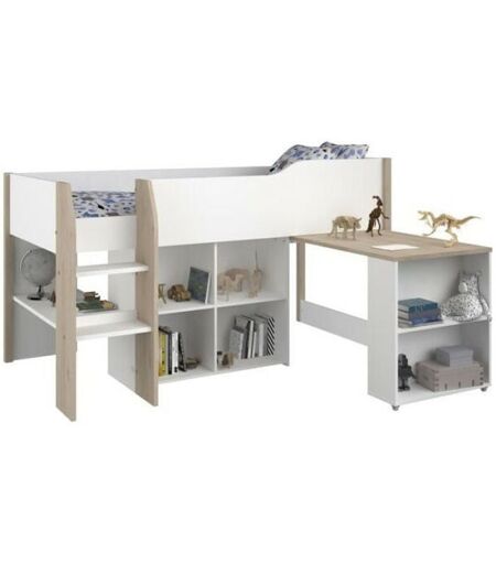 Lit combiné enfant avec bureau rétractable - PARISOT - LIAM - Blanc et chene - Sommier inclus - 90x200 cm